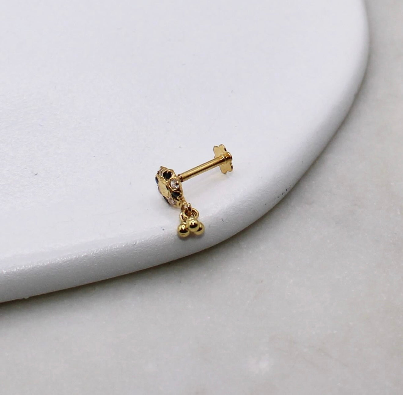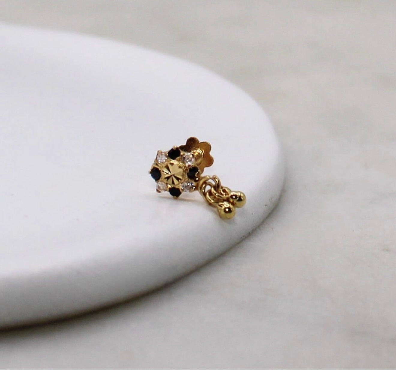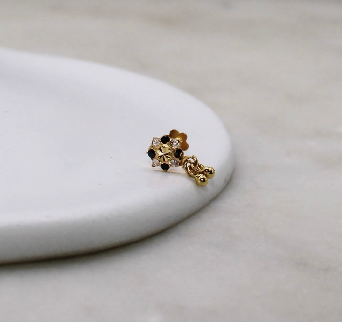 Solid 18carat flower stud with black stones suitable for nose and ear piercings. These are ideal for toddler/children’s earlobes also.