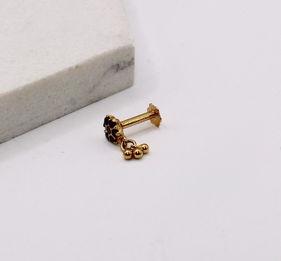 Solid 18carat flower stud with black stones suitable for nose and ear piercings. These are ideal for toddler/children’s earlobes also.