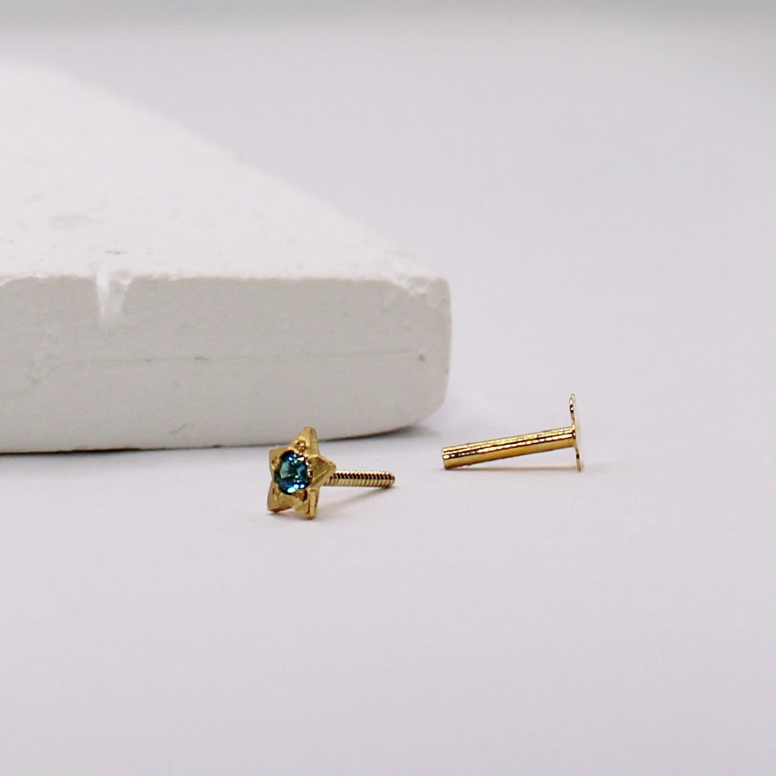 Solid 14carat blue stud suitable for nose and ears. Flat screw backs for a safe and comfortable wear.