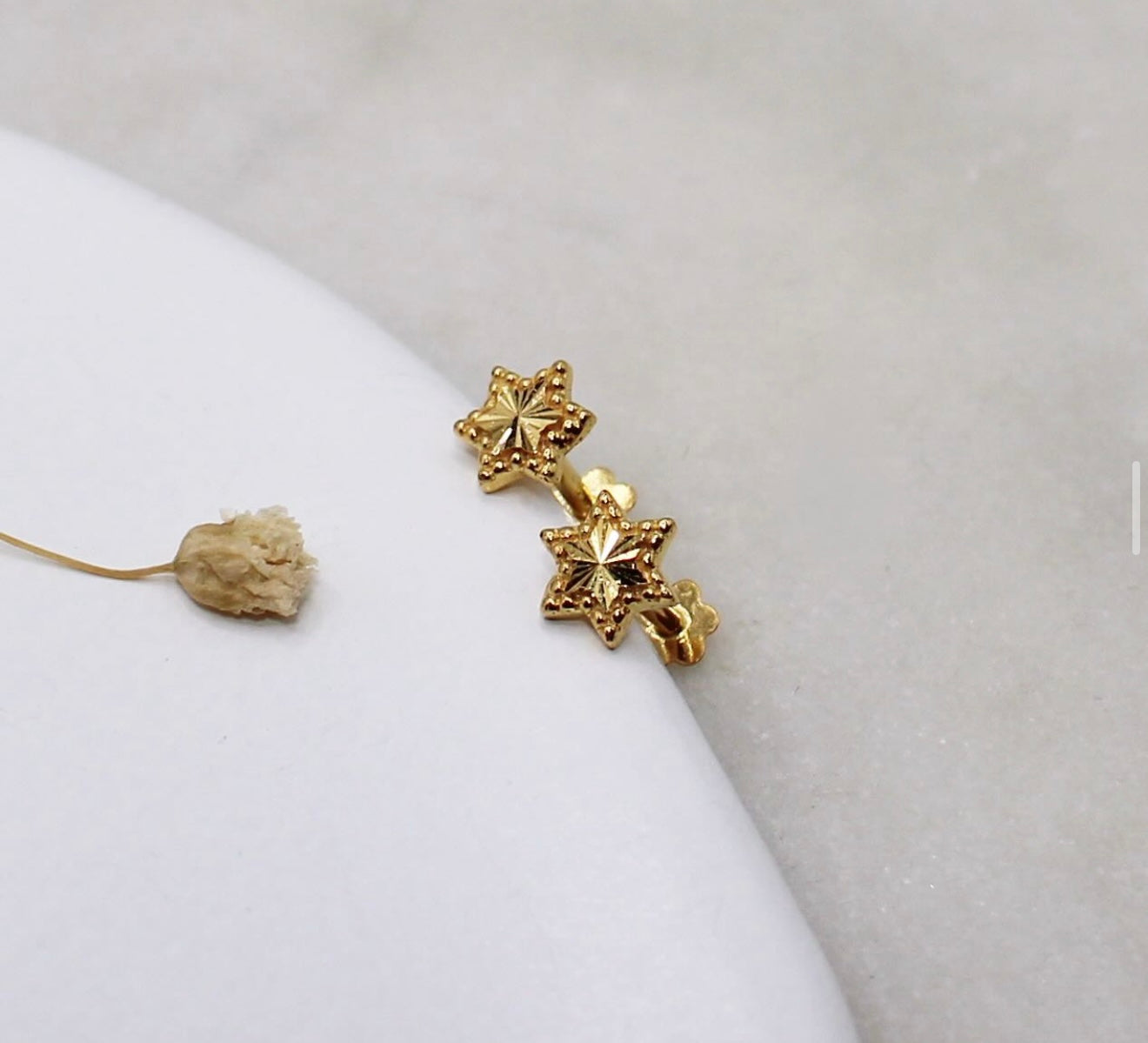 Beautiful 18carat dotted star studs with flat screw backs, suitable for many ear piercings. Single pieces available under ‘nose studs’ also.