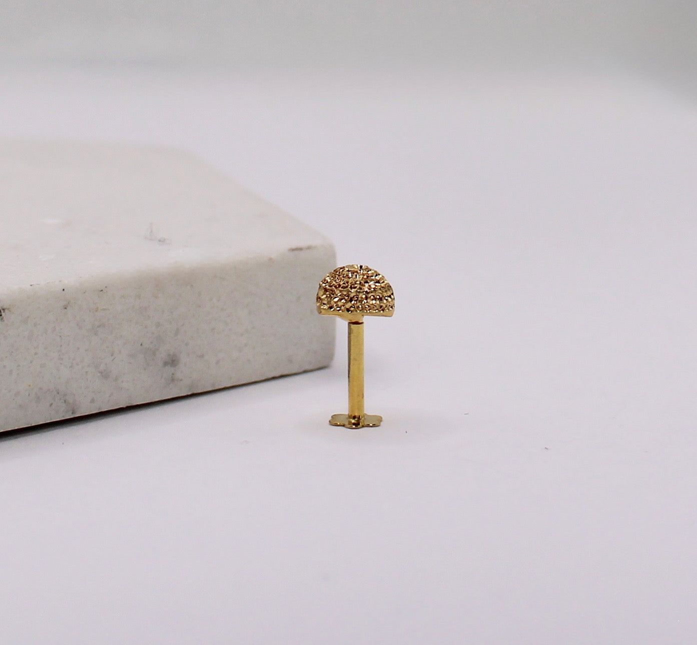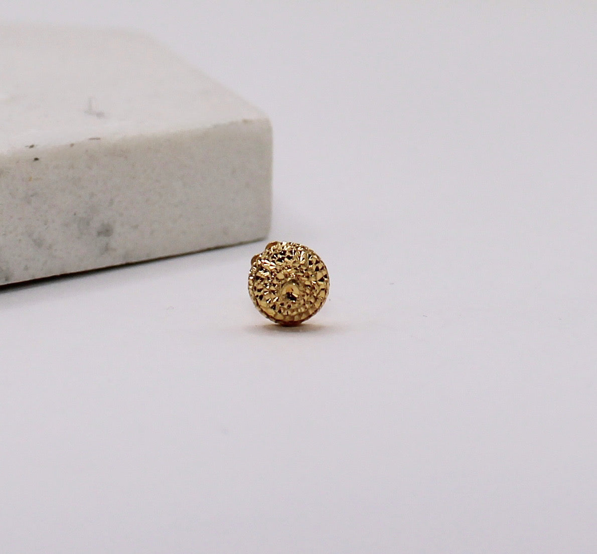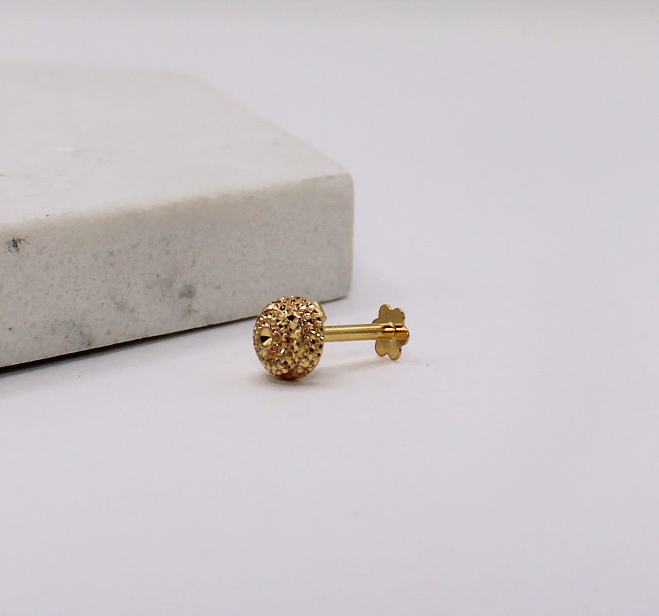 Solid 14carat duster-ball stud suitable for nose and ears. Flat screw backs for a safe and comfortable wear.