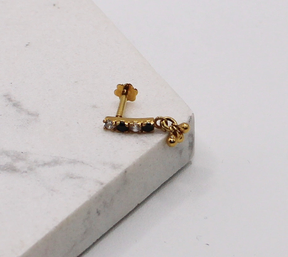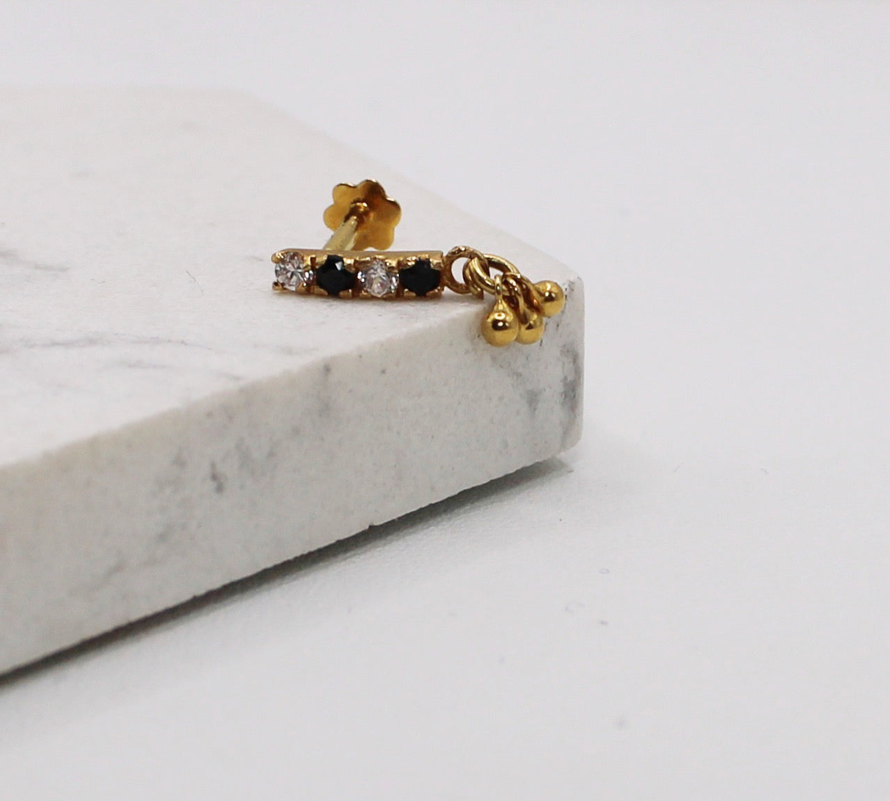 Black and clear stone stud with 3-ball dangles suitable for nose and ears. Flat screw back.