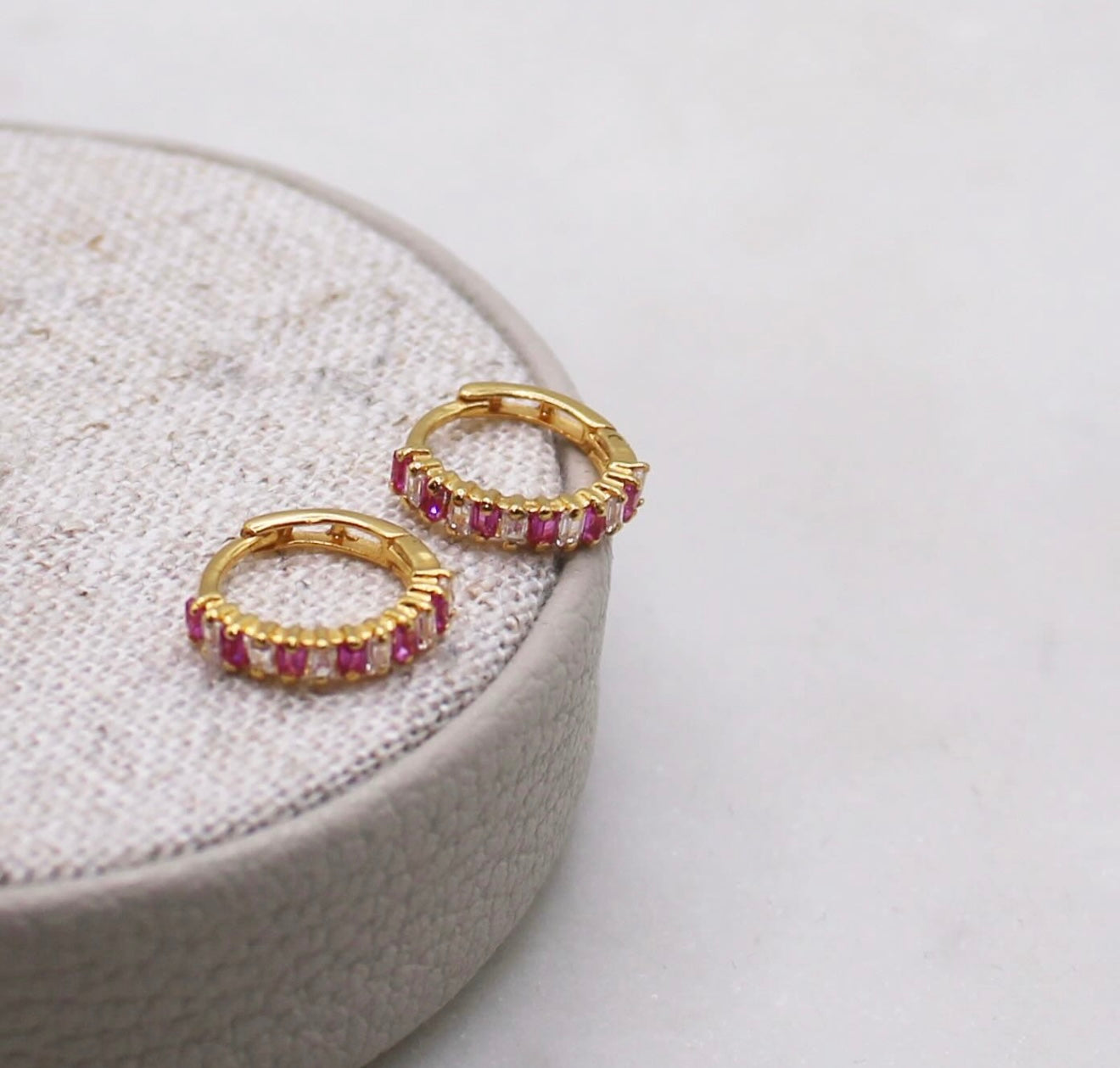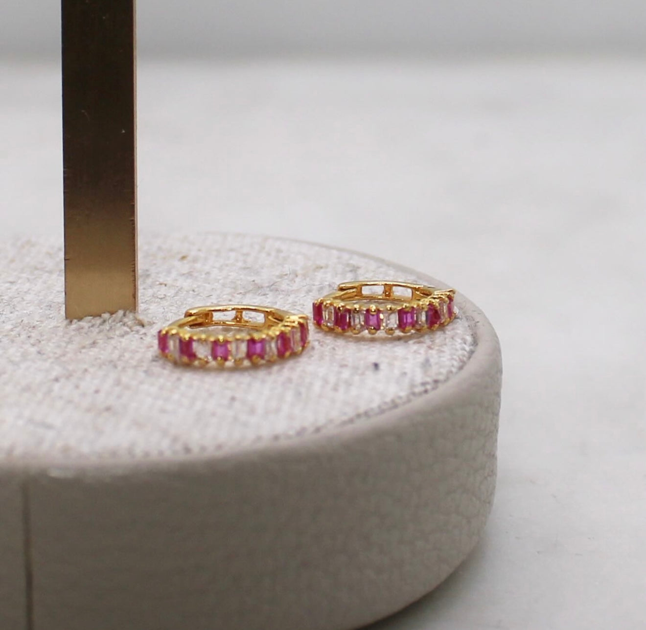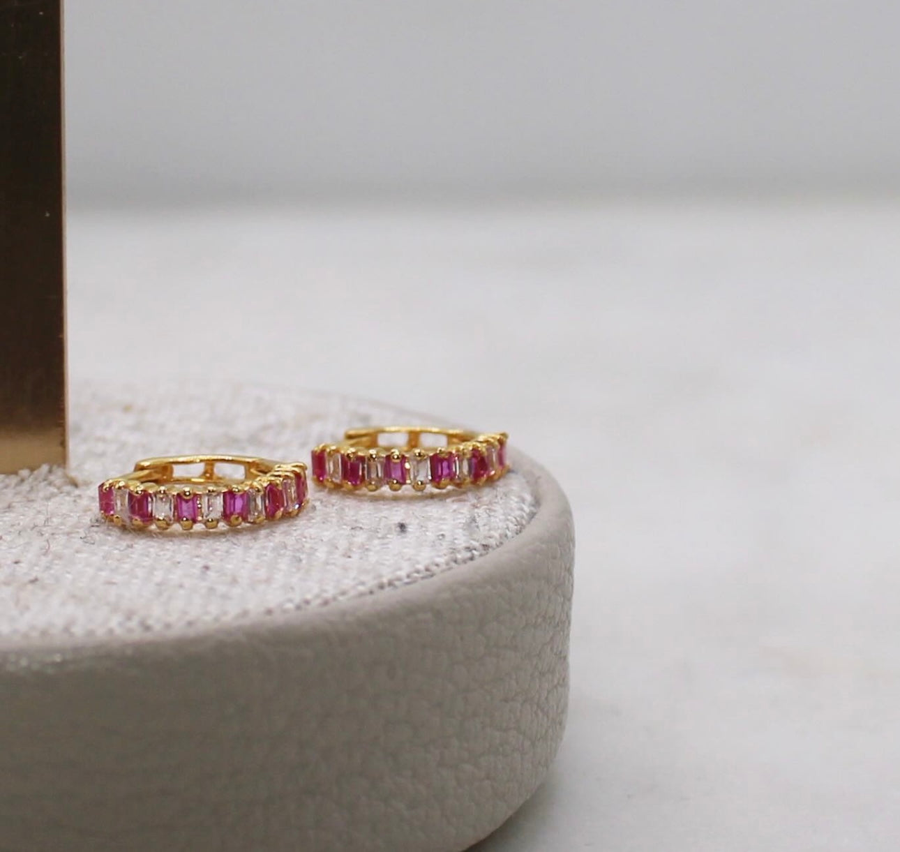 Solid 18carat cluster hoop with pink and clear rectangle stones. These are suitable for both nose and ears. These are also lovely for toddler/children’s earlobes. (Single pieces can be found under ‘nose rings’